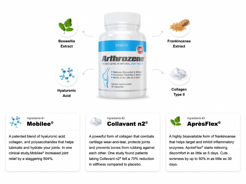 Arthrozene is a joint health supplement formulated by Fisico Inc. It is marketed as a fast-acting, natural remedy designed to address the root causes of joint discomfort. Unlike many over-the-counter pain relievers that only mask the pain, Arthrozene aims to support joint health at a deeper level by targeting inflammation, cartilage breakdown, and lack of lubrication.